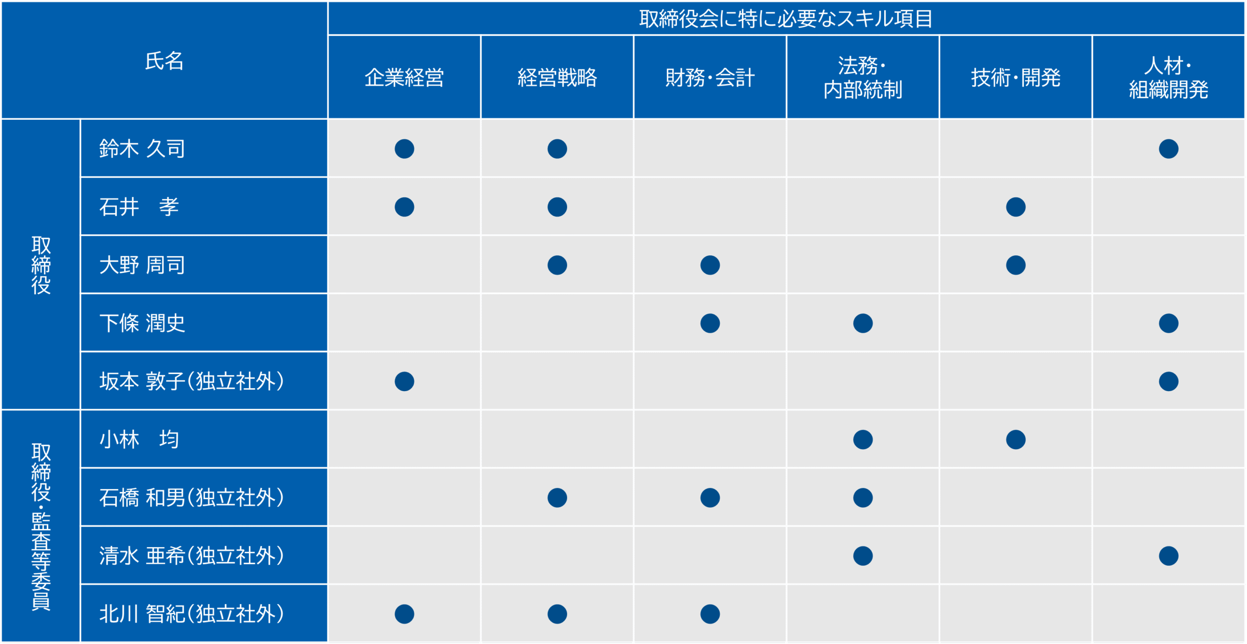 (注)1. 上記は、各氏の有する全ての知見や経験を表すものではなく、特に強みとする分野に●を付しています。